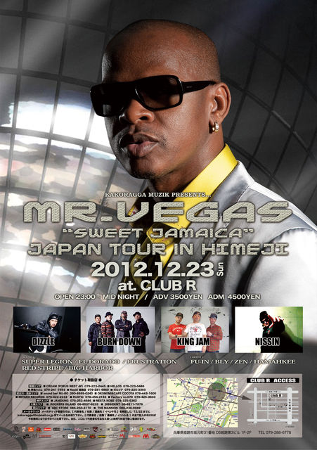 kakoragga muzik presents… Mr.Vegas "SWEET JAMAICA"JAPAN TOUR in HIMEJI 2012.12.23(SUN) @姫路CLUB R OPEN 23:00 CLOSE 5:00 ADV 3500YEN ADM 4500YEN ※前売りチケット200枚限定。チケット完売の場合は、チケット購入者からの 優先入場となりますのでご了承願います。