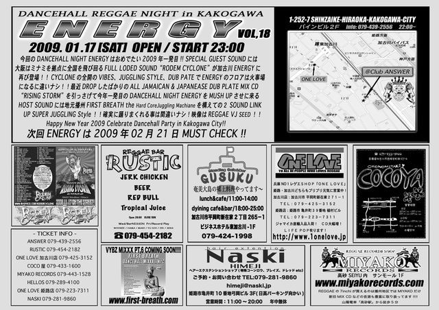 今回のDANCEHALL NIGHT ENERGYはおめでたい2009年一発目!! SPECIAL GUEST SOUNDには大阪はミナミを拠点に全国を飛び回るFULL LODED SOUND“RODEM CYCLONE”が加古川ENERGYに再び登場!!CYCLONEの全開のVIBES、JUGGLING STYLE、DUB PATEでENERGYのフロアは火事場になるに違いナシ!!最近DROPしたばかりのALL JAMAICAN & JAPANEASE DUB PLATE MIX CD“RISING STORM”を引っさげて今年一発目のDANCEHALL NIGHT ENERGYをMUSH UPさせに来るHOST SOUNDには地元播州FIRST BREATH the Hard CoreJuggling Machianeを構えての2 SOUND LINK UP SUPER JUGGLING Style!!確実に踊りまくれる事は間違いナシ!映像はREGGAE VJ SEED!! Happy New Year 2009 Celebrate Dancehall Party in Kakogawa City!!