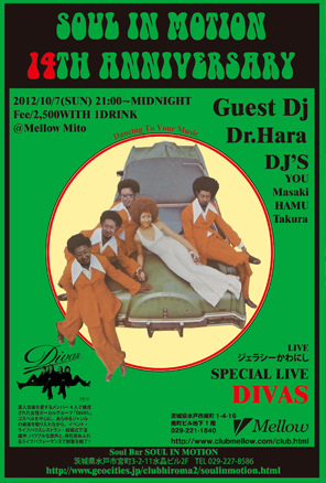 開催終了10/7(SUN)水戸市宮町SOUL Bar"SOUL IN MOTION 14執念"開催!!ゲストには都内中心に活躍中の女性ボーカルグループ"DIVAS"登場!!!!!