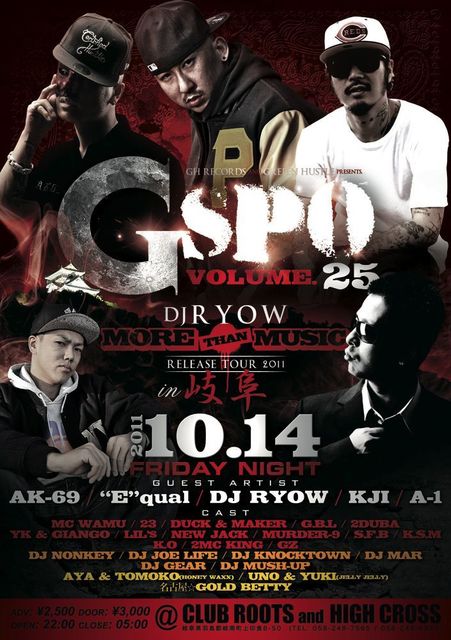 ■GSPO vol.25〜MORE THAN MUSIC RELEASE TOUR IN GIFU〜 ■日時 : 2011年10月14日(金)/OPEN 22:00:CLOSE 5:00 ■会場 : CLUB ROOTS & HIGH CROSS/岐阜県羽島郡岐南町上印食8-50 ■チケット : 前売り2,500円/当日3,000円 INFO : HIGHCROSS(TEL : 058-248-0339) ■主催:GH-RECORDS ■GUEST ARTIST DJ RYOW AK-69 EQUAL KJI A-1
