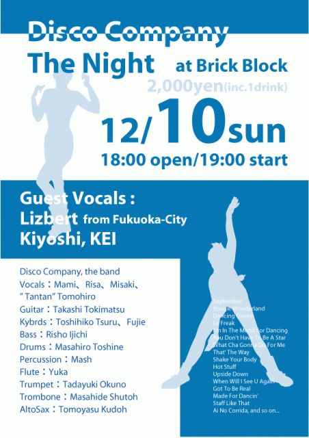 演奏曲: Ai No Corrida/Boogie Wonderland/Can't Take My Eyes Off Of You/Celebration/Dancing Queen/Endless Love/Got To Be Real/Hot Stuff/I'm In The Mood For Dancing/I Was Made For Dancin'/Knock On Wood/Le Freak/Pick Up The Pieces/Play That Funky Music/Special To Me/September/Shake Your Body/Staff Like That/Superstition/That' The Way I Like It/Upside Down/What Cha Gonna Do For Me/When Will I See U Again/You Don't Have To Be A Star