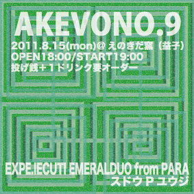 ■■■EXPE.IEGUTI EMERALDUO from PARA 毎回異なったアプローチで進化を続けるギターアーティスト"EXPE"による2011年サマープロジェクト"EMELALD"。 小松音響研究所が製作した真空管サウンドシステムを使用し、暖かいアコースティック的な音量&音質で、現代音楽的なアルゴリズムによる構築美、フュージョン的な浮遊感と溶解、ドローンの持続による覚醒感、そしてポリリズム変拍子ファンクの追究をテーマとした実践ユニット。 とは言え難しい事は抜きに、音に集中して入り込めば気持ち良い新感覚体験があるはず☆エメラルド!