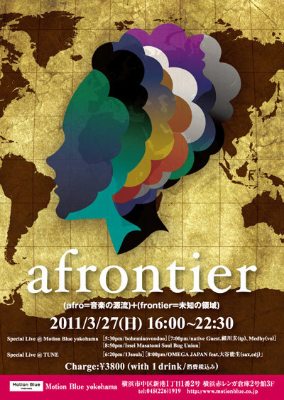 今回のアフロンティアは、モーション・ブルー・ヨコハマの9thアニバーサリーウィークを華やかに彩るべく盛り沢山な内容だ! メインフロアのライブステージには、クラブジャズシーンで人気上昇中のbohemianvoodooが初登場!さらには前回怒涛の演奏で会場を沸かせた重量級ジャズファンクユニットIssei Masatomi Soul Bug Union、また新編成でサウンド面に深みを増したnativeが、ゲストに細川玄、Medby、スペシャルゲストに松岡"matzz"高廣を迎えてのスペシャルセッションで参加する。