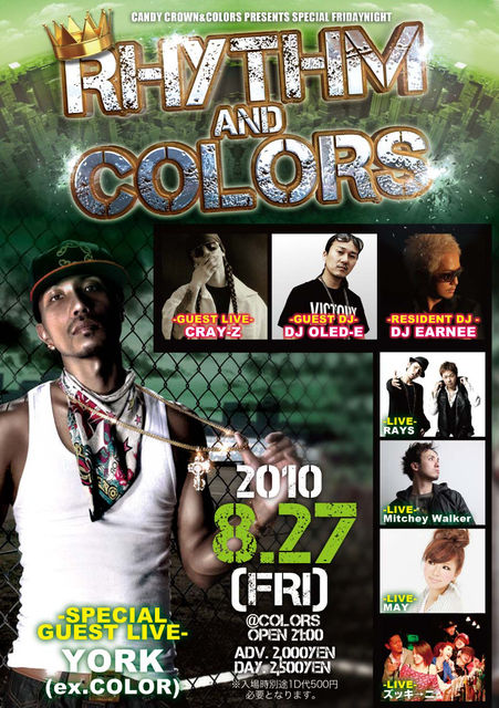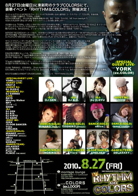 ○SP GUEST LIVE YORK(ex.COLOR) ○GUEST LIVE CRAY-Z ○GUEST DJ DJ OLED-E ○RESIENT DJ DJ EARNEE ○LIVE RAYS Mitchey Walker MAY ズッキ→ニ NA2MI feat.SHAILLO ○DJ DJ GEN DJ B.O. DJ H-RYU DJ NAHO ○HOST MC ZEEK ○FLOOR DANCER CHELSEA HIROYO&SHIHO ○DANCE(SOLO) MINAKO(AH!tistic) YOSHIKO(AH!tistic) eRico tama(TiGRESS) NORIKO ○DANCE(TEAM) Young Star DELAXXXY Lady BABA Pana☆p PL!NCE【THE SEX!!!】