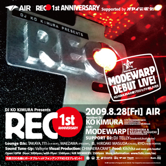 After 12 years of Ko Kimura's residency [KOOL] @ YELLOW, Ko started a new party [REC●] with its core concept to bring out the best in digital sound within the club environment. Sound engineer Valkyrie and Ko himself do sound checks and adjust the system at AIR throughout the night. 28th August celebrates the 1st anniversary of [REC●] and features MODEWARP in a live performance. MODEWARP consists of Ko Kimura and Kazuaki Noguchi and they produce and remix mainly for FUTIC RECORDINGS TOKYO. This will be the 1st live performance ever for the veteran DJ Ko Kimura so make sure not to miss it!!