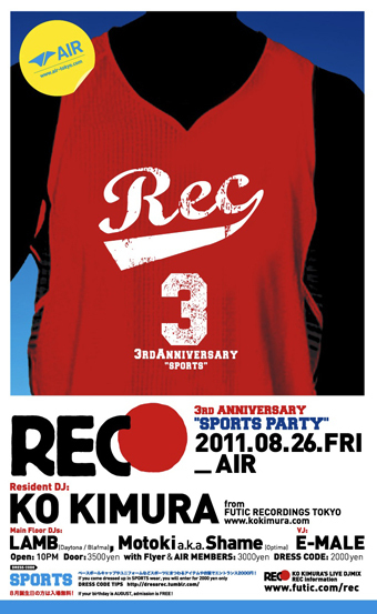 Japanese veteran DJ KO KIMURA's home-ground party is [REC●] @AIR and we celebrate its 3rd anniversary on Friday 28th August! At [REC●] the sound system is specially tuned to maximize the benefits of digital sound today. Sound engineer VALKYRIE and KO do sound check before the party carefully and they adjust to keep good sound & volume throughout the night. On B2 corridor, we'll have Girls Booth; foods, make-up & hair stylist, hand massage booth, and body paint. So if you get tired from dancing, you can relax too. Theme of the night is SPORTS. Wear your favorite sports team uniform/cap, bring sports related items with you, or improvise your outfit to match the theme to enter with only 2000 yen! If your birthday is August, you can enter for free. Plan a birthday party for August born friends at REC●!!