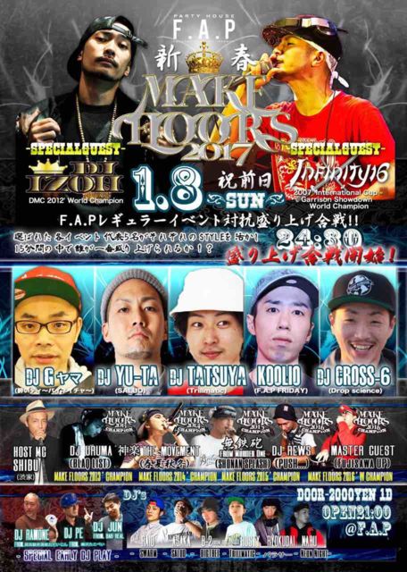 毎年恒例となりました湘南藤沢F.A.P.が、お届けする新春祭り!! 毎年F.A.Pの様々なレギュラーイベントの中から最も元気が有り勢いのあるレギュラーイベントの代表DJ5人が15分間の中でジャンル問わずStyleを活かし、どれだけお客を喜こばし盛り上げられるかを競い合う盛り上げ合戦!お客さんも普段行かないイベントのDJプレイやジャンルを見たり聴いたり出来るので色々な発見や感じる事が出来るので楽しめると思います。前回のMAKE FLOORS 2016''は、まさかのMASTER CUESTとDJ rewsの同点優勝で締めくくり!! 今回のMAKE FLOORS 2017'では、2013'初代王者のDJ URUMA. 2014'王者 神楽 The Movement. 2015'王者 無鉄砲 from. MURDER ONE.は勿論の事、スペシャル ゲストにはアジア人では2人目となる快挙をなしとげたDMC 2012'ワールドチャンピオンでもあるDJ IZOHと2007'にNYで開催されたワールドクラッシュInternational Cup - Garrison Showdownで見事に世界チャンピオンに輝いたInfinity 16が登場ダァ〜♪w そして日頃から湘南エリアを中心に各地のイベント現場をRockしているDj & SELECTORが勢揃い!! しかも今回はアーリータイムからBar REALの代表DJ JUNと、たこぺい / mottの代表でもあるDJ PEと、高級居酒屋おだいじんのDJ RAMONEが早い時間からDJ PLAYで楽しませますぅ!!w さぁー今回の新春MAKE FLOORS 2017'王者に輝くのは誰ダァ〜♪w