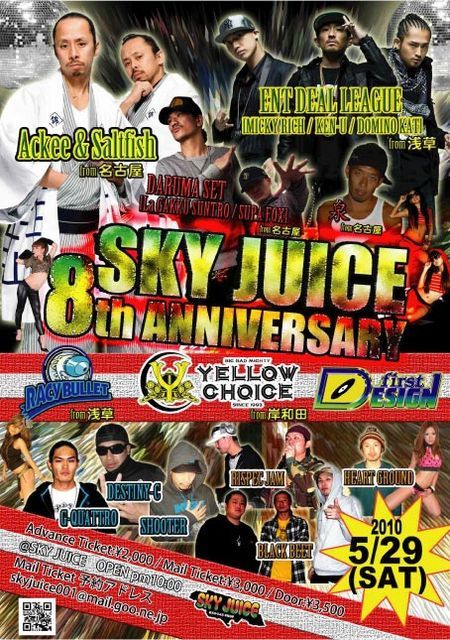 Advance Ticket:2000yen Mail Ticket:3000yen Door:3500yen OPEN pm10:00 Mail Ticket予約アドレス: skyjuice001@mail.goo.ne.jp