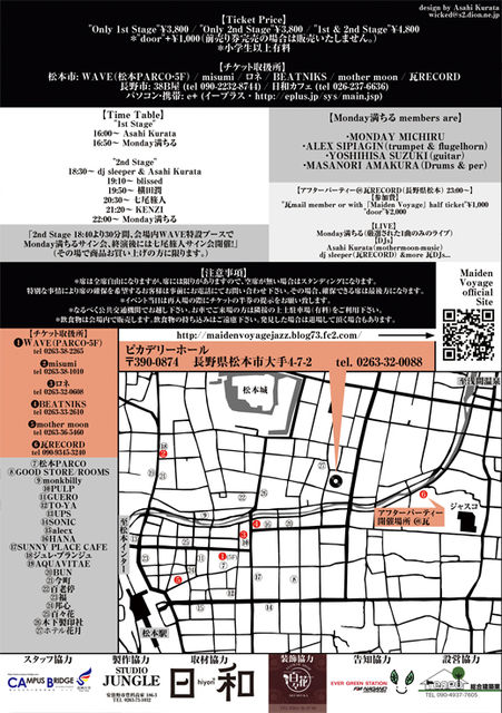 FM長野 / 日和 / Campus Bridge / 松本PARCO / WAVE / JUNGLE STUDIO / Tempo / 百々花 / RECORD ROOM / ALECX / SONIC / BEATNIKS / mother moon / GOOD STORE / misumi / ロネ / GUERO / UPS / TO-YA / SUNNY PLACE CAFE / ジュレ・ブランシュ / BAR AQUAVITAE / 今町 / BUN / 福 / 百老亭 / 邦心 / あるぷす / ホテル花月 / 枇杷の湯 / 木下製印社 / アムール / モーションスタイル / Audio Intel / Lin Total Fashion Place / 38B屋 / Chelu / キリンビール