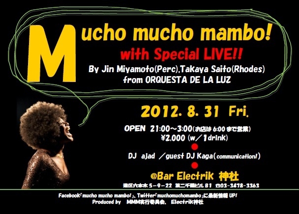 いい音楽、いいフロア、とにかく踊りまくれる!と大好評のスーパー・カリエンテ(=super hot)なマンボナイト、Mucho Mucho Mambo!のSpecial企画を8月31日(金)六本木・Bar Electrik神社にて開催致します!