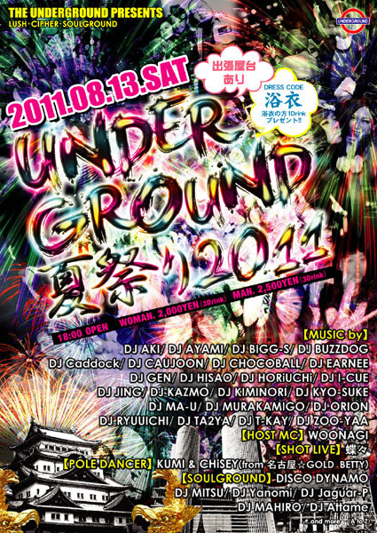 2011.08.13.SAT THE UNDERGROUND PRESENTS(LUSH・CIPHER・SOULGROUND) UNDERGROUND夏祭り2011 at.LUSH・CIPHER・SOULGROUND 18:00 OPEN WOMAN. 2,000YEN(3Drink) MAN. 2,500YEN(3Drink) DRESS CODE: 浴衣(浴衣の方1Drinkプレゼント!!)