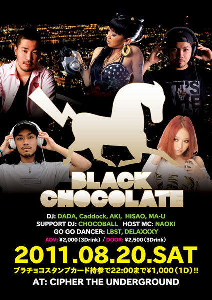 2011.08.20.SAT BLACK CHOCOLATE 19:00 START TICKET. 2,000YEN(3D) DOOR. 2,500YEN(3DN) MUSIC by: DJ DADA/ DJ Caddock/ DJ AKI/ DJ HISAO/ DJ MA-U SUPPORT DJ: CHOCOBALL HOST MC: NAOKI GOGO GIRL: LBST/ DELAXXXY