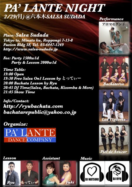 ★PA' LANTE NIGHT★★ PA'LANTEダンスコンパニーのクラブイベントです。 サルサ、バチャータ、キゾンバやメレンゲオールアフロラテンを楽しめるパーティーです。 会場は、六本木の人気バーサルサスダダです。 Como and enjoy salsa, bachata, kizomba, merengue, etc in one of the best latin bars in roppongi.