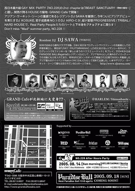 ********************************************* さらにアフターアワーズの新星☆JeTもスタンバイ! NO.228 AFTER HOURS PARTY JeT 2005.08.14 Sun morning @CLUB SAOMAI(難波/ROCKETS隣) http://www.musicstuff-pro.com/gate3/ djs:CHU*,Kou Kishimoto door open:6am〜11am adm:2,500yen/1d(visitor)、2,000yen/1d(w/f)