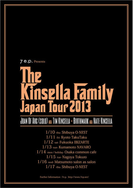 The Kinsella Family Japan Tour 2013 『Joan Of Arc (solo) aka Tim Kinsella + Birthmark aka Nate Kinsella』 2013.1/14(月祝) 19:00open 19:30start 予約¥3500 当日¥4000(ドリンク別) 出演: ■JOAN OF ARC (SOLO) aka TIM KINSELLA 89年シカゴにて、実弟マイク・キンセラ(Owen)、デイヴィー・ヴァン・ボーレン(ザ・プロミス・リング)らと共に10代にして、エモ・シーンの先駆的な存在として知られる伝説的なキャップン・ジャズを結成。同バンド解散後、自身の独創的なヴォーカリゼーションとギター・プレイを核に据えた、不定形グループ、ジョーン・オブ・アークでポスト・ロック・シーンに多大な影響を与えるとともに、メイク・ビリーヴやフレンズ/エネミーといった別ユニットやソロ名義など数えきれない程大量の作品をリリース。更には自主映画の監督も務めるシカゴきっての才人。最新作は本ツアーと同じくティムの弾き語りをフィーチャーした『Joan Of Arc』。10年のOwenとのスプリット・ツアー以来3年振りの来日。 http://www.joanfrc.com/ ■BIRTHMARK aka NATE KINSELLA キャップン・ジャズ〜ジョーン・オブ・アークのティム&マイク・キンセラ兄弟の従兄弟にあたるネイト・キンセラ。メンバーとして参加したジョーン・オブ・アークおよびメイク・ビリーヴ、アルバム制作に関わったOwenなど従兄弟達の各ユニットにも密接に関わり、そのマルチプレイヤーぶりはドラムとキーボードを同時に演奏するという驚愕のメイク・ビリーヴ来日公演でも知られるところ。07年にはソロ・ユニット、バースマークとしてデビューアルバム『The Layer』を発表。12年にはシカゴの名門Polyvinylと契約。移籍第一弾(通算3枚目)となる『Antibodies』は、従兄弟達とも異なるそのエレガントなソングライティングの才とマルチプレイヤーとしての才を十二分に発揮した充実作となった。 http://www.joanfrc.com/birthmark.html ★予約、お問い合わせ:7e.p. http://www.7ep.net/onlinestore/tour_kinsella.php