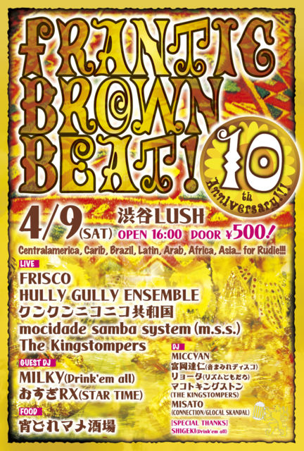 スカ、レゲエ、ラテン、アフロ、ジプシーなど中心のワールドミュージックイベント「FRANTIC BROWN BEAT!」は今年で10周年! 皆さんとたくさん乾杯したく、10周年特別価格の500円で開催します。しかもこの面々を500円なんて豪華としか言いようがありません。 今週土曜日は渋谷LUSHに大集合でお願いします!