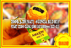 AMAZIN' VOL.13 2009.3.28(SAT) @銀座ビル地下一階 当日¥1000(1DRINK+1CD) START 22:00 CLOSE 5:00 ★AMAZIN'ORIGINAL MIXCD PRESENT!! ★DJ★ DJ TOMOHIKO(FUKUOKA) DJ 4to-key(FUKUOKA) DJ MOKO(SAGA) DJ MONYA DJ O DJ Chem DJ HIROSAN ★MC★ LARGE
