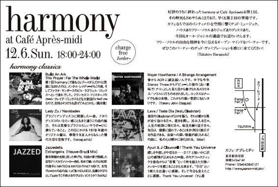 好評のうちに終わったharmony at Café Après-midi第1回。その熱気もさめやらぬ12月6日、早くも第2回の登場です。カフェならではのインティメイトな空間に響くグッド・ミュージック。ハウスありフリー・ソウルありジャズありディスコあり。今回もオール・ジャンルの選曲でお送りいたします。フリー・ソウルの自由な精神を今に伝えるオープン・マインドなパーティーです。ぜひこのパーティーのグッド・ヴァイブレーションを感じに来てください!(Takahiro Haraguchi)