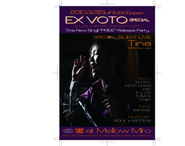 ■2010.3.21(Sun) 22:00open [EX VOTO SPECIAL] TINA NEW SINGLE "PRIDE" RELEASE PARTY All Mix & Special Guest Live SPECIAL GUEST LIVE> TINA(EPIC RECORDS) DJ> YOSSY. KITA-CHAN. YSK. E-LOS. TOM-B. TAIKI LIVE> MASAE SUPORT> SOUL IN MOTION FEE: ADV \2.500(1d) : DAY \3.500(1d)