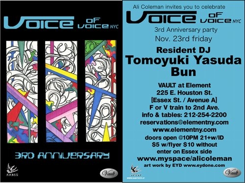 friday nov 23rd...ur invited to celebrate with Voice of voice NYC in the Vault @ Element...w/ resident djs Tomo Yasuda & Bun (Boon)...join our monthly gathering in november as we celebrate our 3rd Anniversary w/ a kick-ass nite of debaucherous fun…so come on out and share sum good ol' fashioned fun!! dancin, sweatin and drinkin to the wee hours of the morn