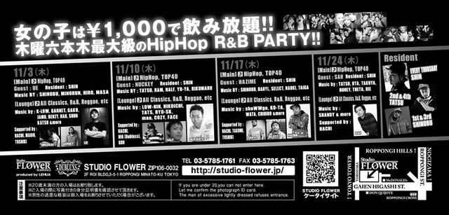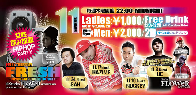[以下詳細] 11/24 (木) 22:00-5:00 Every Thursday『FRESH』-HipHop & All Good Music Party- @Studio FLOWeR 六本木http://studio-flower.jp/