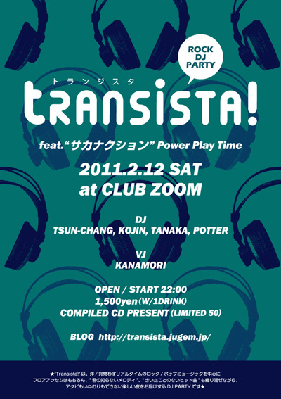 "Transista!" feat."サカナクション"Power Play Time 2010.2.12(Sat) at CLUB ZOOM (福岡市中央区天神 3-4-15天神バッカス館6F) OPEN/START 22:00 1,500yen(W/1Drink) DJ: TSUN-CHANG, KOJIN, TANAKA, POTTER VJ: KANAMORI ※アーティスト本人の出演はございません