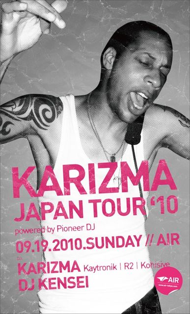 KARIZMA(Kaytronik, R2, Kohisive) Basement BoysクルーとしてDJ Spenと共に、長きにわたり活躍し、ハウスのヒット曲を量産してきたKARIZMA。しかし、2006年に発表した“Twyst This”の大ブレイクをきっかけに、ソロとして一躍注目を浴びるようになる。その後、デビューアルバム“a mind of its own”、セカンドアルバム“a mind of its own V.2.0”をリリース。最近では、Strictly RhythmからミックスCD ”Strictly Miami”を手掛けるほか、Dennis Ferrerの大ヒットアンセム、“Hey Hey”のリミックスをKaytronik名義で手掛けるなど話題となっている。強烈なインパクトを持つ彼のプロダクションは、ライブ感を内包し、テックでありながらソウルフルで、どのジャンルにもカテゴライズされない独自性を宿している。そのサウンドスタイルはGilles Peterson、Timmy Regisford、Quentin Harris、Louie Vega、DJ Spinna、Tony Humphries、Dennis Ferrerなどダンスミュージック界のレジェンドからホープまでが絶賛。また、イギリスでダブ・ステップと共に盛り上がりを見せるシーン、UKファンキーのルーツ的存在として神格化されている。 そして、KARIZMAのもう一つの魅力・・・DJ、表現者としての才能である。ガラージ、クラシック〜テッキーなハウス、ジャズまでをCDJ3台駆使し、楽器を扱うかの様に演奏。ライブさながらに音楽をリアルタイムで構築していく姿は、フロアに「衝撃」の二文字を刻み込む。今回のジャパンツアーでは Pioneerの最新機材DJM-2000とCDJ-2000を、本人の希望で日本から空輸。ツアー開催45日前からDJM-2000の機能、多彩なビートエフェクトや、フリクエンシー・ミックスをマスターするためにトレーニングを積むという異例のプロジェクトに発展した! http://kaytronik.com/k2/jp