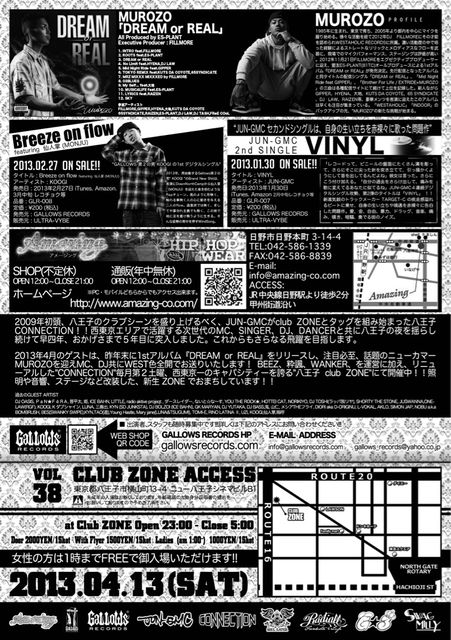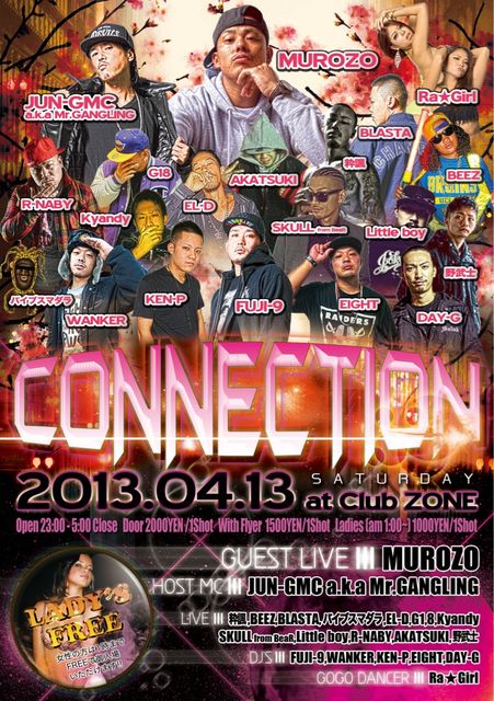 2009年初頭、八王子のクラブシーンを盛り上げるべく、JUN-GMCがclub ZONEとタッグを組み始まった八王子 CONNECTION!!西東京エリアで活躍する次世代のMC、SINGER、DJ、DANCERと共に八王子の夜を揺らし続けて早四年、おかげさまで5年目に突入しました。これからもさらなる飛躍を目指します。 2013年4月のゲストは、昨年末に1stアルバム『DREAM or REAL』をリリースし、注目必至、話題のニューカマーMUROZOを迎えMC、DJ共にWEST色全開でお送りいたします! BEEZ、粋諷、WANKER、を運営に加え、リニューアルした"CONNECTION"毎月第2土曜、西東京一のキャパシティーを誇る"八王子 club ZONE"にて開催中!!照明や音響、ステージなど改装した、新生 ZONE でおまちしています!!