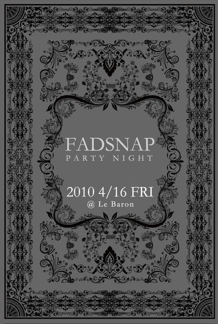 ■ARTISTS INFORMATION■ ・Ali& from 80kidz デビュー・アルバム『THIS IS MY SHIT』が大ヒットを記録、さらにパリのクリエイター集団が発表する「Kitsune Maison 7」に参加、昨年のFuji Rock Festival ’09 2日目深夜のレッド・マーキーでは入場規制がかかるほどの大観衆と大歓声で迎えられた。2009年12月16日に初のリミックス・ワーク集 『THIS IS MY WORKS』を発表し、いまや日本のエレクトロ・シーンを代表するアクトとしてワールドワイドな支持を集めている80kidzのAli&氏が FADSNAP PartyNightに登場! www.myspace.com/80kidz
