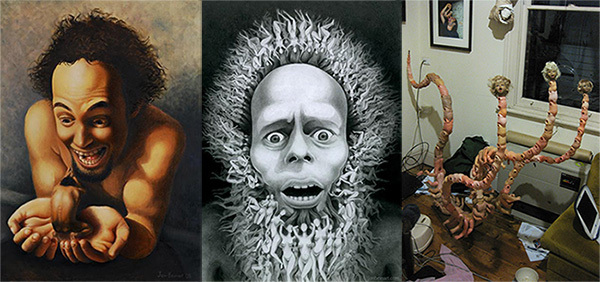 Drawings, Paintings & The Worlds Largest Toddlerpede by Jon Beinart http://beinart.org/info/jon-beinart.php(founder of www.beinart.org) left 'Self Portrait in Oils' oils - middle 'Naked Ladies in My Beard' pencil - right 'The Worlds Largest Toddlerpede' sculpture (work in progress... will be completed for this show)