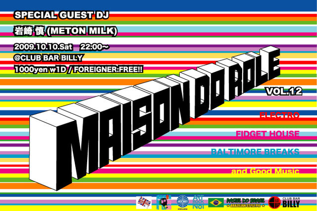 MAISON DO ROLE VOL.12 2009.10.10.Sat@CLUB BAR BILLY 〜ELECTRO, FIDGET HOUSE, BALTIMORE BREAKS and Good Music!! 〜 [DOOR] 1000yen w1D / FOREIGNER:FREE!! [OPEN] 22:00 先着50名様にOriginal Mix CDプレゼント!! 振舞いテキーラあり!!