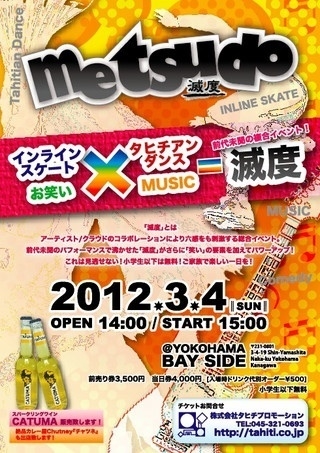 【Outline】 Title:metsudo 『滅度』 Day:2012年3月4日(日) Time:14:00 OPEN、15:00 SHOW 〜21:00 CLOSE Place:Bay Side Yokohama Access:横浜市中区新山下3-4-19
