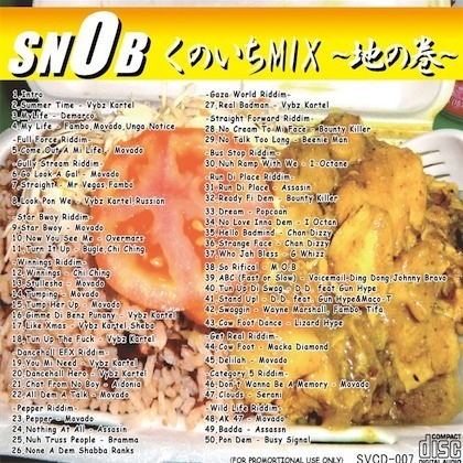 ◎【SNOB くのいち MIX〜地の巻〜】曲目リスト 1,Intro 2,Summer Time Vybz Kartel 3,MyLife Demarco 4,My Life Fambo,Movado,Unga Notice 5,Come Out A Mi Life Movado -Full Force Riddim- 6,Go Look A Gal Movado -Gully Stream Riddim- 7,Straight Mr.Vegas,Fambo 8,Look Pon We Vybz Kartel,Russian 9,Star Bwoy Movado -Star Bwoy Riddim- 10,Now You See Me Overmars 11,Turn It Up Bugle,Chi Ching 12,Winnings Chi Ching -Winnings Riddim- 13,Stullesha Movado 14,Tumping Movado 15,Tump Her Up Movado 16,Gimme Di Benz Punany Vybz Kartel 17,Like Xmas Vybz Kartel,Sheba 18,Tun Up The Fuck Vybz Kartel 19,You Mi Need Vybz Kartel -Dancehall EFX Riddim- 20,Dancehall Hero Vybz Kartel 21,Chat From No Boy Aidonia 22,All Dem A Talk Movado 23,Pepper Movado -Pepper Riddim- 24,Nothing At All Assasin 25,Nuh Truss People Bramma 26,None A Dem Shabba Ranks 27,Real Badman Vybz Kartel -Gaza World Riddim- 28,No Cream To Mi Face Bounty Killer -Straight Forward Riddim- 29,No Talk Too Long Beenie Man 30,Nuh Ramp With We I-Octane -Bus Stop Riddim- 31,Run Di Place Assasin -Run Di Place Riddim- 32.Ready Fi Dem Bounty Killer 33,Dream Popcaan 34,No Love Inna Dem I Octan 35,Hello Badmind Chan Dizzy 36,Strange Face Chan Dizzy 37,Who Jah Bless G Whizz 38,So Rifical M.O.B 39,ABC (Fast or Slow) Voicemail,Ding Dong,Johnny Bravo 40,Tun Up Di Swag D.D. feat.Gun Hype 41,Stand Up! D.D. feat. Gun Hype&Maco-T 42,Swaggin Wayne Marshall, Fambo, Tifa 43,Cow Foot Dance Lizard Hype 44,Cow Foot Macka Diamond -Get Real Riddim- 45,Delilah Movado 46,Don't Wanna Be A Memory Movado -Category 5 Riddim- 47,Clouds Serani 48,AK 47 Movado -Wild Life Riddim- 49,Badda Assassn 50,Pon Dem Busy Signal