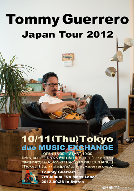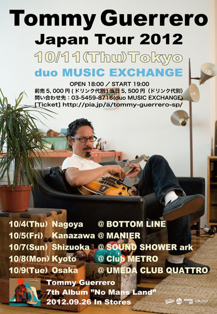 <Tommy Guerrero Japan Tour 2012> 10/11(Thu) Tokyo@ duo MUSIC EXCHANGE 前売5, 000円(ドリンク代別)/当日5, 500円(ドリンク代別) 問い合わせ先:03-5459-8716 チケット チケット: http://pia.jp/a/tommy-guerrero-sp/