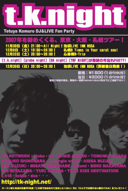 ★かつては夢だった現実、 “t.k.night”2007年最後の札幌開催は、 小室哲哉さん49歳のお誕生日(11/27)をお祝しての開催です。 時代をさまよう天使たちCome On Everyboby! 夜間飛行にはあまりにも速い旅、 頭を振るたびに明日まで逃げそう…。 『札幌D times in Your carat soul A』のドアの前、 クラクション鳴らせば夜が始まります。