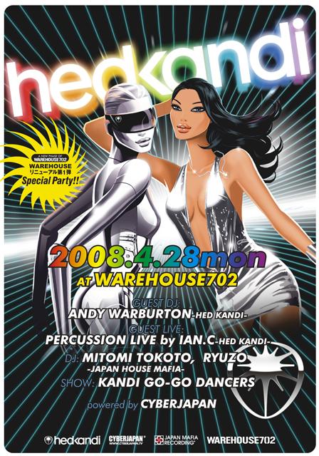 第一弾は、過去6年間に渡り、IBIZAのHED KANDIでレジデントをつとめ、世界中のHED KANDIパーティーを渡り歩くAndy Warburtonが来日。今年、HED KANDI が新たに送り出した『Kandi Lounge』のミックスも担当したAndyのプレイは必聴!さらに、今回はスペシャルライブとして、パーカッションライブを行なうIAN.Cが来日。最新 E-Drums を操り、オーディエンスを熱狂の渦に巻き込む。日本側は、「THE HED KANDI MIX 2008」に、日本人初のトラック収録となったMITOMI TOKOTO。初のMIX CD『THE WHITE MIX』も発売しノリにノッテるプレイと、周りを固めるはKANDI DANCERS達、さらに、HED KANDI の世界観そのままのデコレーションに彩られるパーティーは、まさにキラキラハウス決定版!!