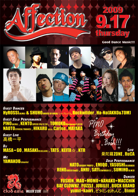 8周年後、最初の開催!!! 9月のAffectionももちろん、盛り上げていきたいと思っています。 今回も間違いないアーティストの出演が決定しました。 ゲストダンサーには新ネタを引っさげて登場!!!「HyROSSI&SHUHO」に、「Rockwilder」!!!そして、若手注目チームの「Ha-Na」、ゲストソロパフォーマンスには日本のダンスシーンをリードし続けるTOP DANCERに、実力派の若手が魅せます。 ゲストライブには久しぶりの登場「高橋一平」!間違いない歌唱力、そしてセクシーなライブパフォーマンスにやられちゃって下さい。 その他ももちろん次世代シーンを担う注目のアーティストが続々と登場します。 DJには様々なシーンで活躍する上質のDJ陣がセレクトするDance Mixでお楽しみください。先着でMixCDプレゼントもありますよ☆ そして9月といえば毎年恒例となった世界のダンサー"PINO"のバースデーバッシュ!!!おめでたい日になりそうです。 Good Music ! Good Showcase ! and Love & Peace♪