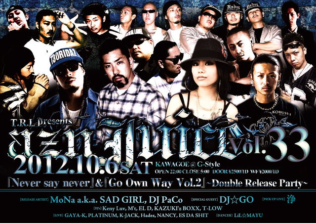 今回の[AZN Juice vol.33]は、 MoNa a.k.a. Sad Girl『Never say never』&DJ PaCo『Go Own Way Vol.2』 〜Double Release Party〜 [RELEASE ARTIST]は、 今年の5月に4枚目のアルバム[NEVER SAY NEVER]をリリースし、人気セールス共に成長し続け女性信者急上昇中!!今やシーン内でのライブ動員期待度NO.1と言っても過言ではないMoNa a.k.a SAD GIRL!! そして、今年8月にチカーノ、ラテンロックなどのBARRIO MUSICを中心としたMIX CD[Go Own Way]シリーズ第2弾をリリースした『研究、追求、探求に終わりは無い!!』をモットーに幅広く活動をし、 今や独自が設立したTEAR DROP Ent.から数々のMIX CDを展開しているDJ PaCo!! 更に今回の [SPECIAL GUEST]には 、今年7月に4枚目のアルバム[MY AZZURRO]をリリースしたのも記憶に新しいRIDE RECORDZ代表DJ☆GO!! また[PICK UP LIVE]には 、STREETで経験した嘘・偽りないリリックと憂国烈士の様な前のめりのRAPを武器にしたJ-GREN IKKAの浄!! 『Never say never』&『Go Own Way Vol.2』 のリリースパーティーを篤と楽しんで下さい!!
