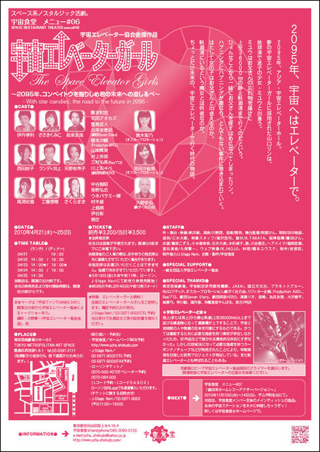 一般社団法人 宇宙エレベーター協会(http://www.jsea.jp/)は、宇宙エレベーターをより多くの方たちに知っていただくための啓発活動の一環として、演劇ユニット宇宙食堂による活劇“宇宙エレベーターガール”を後援することになりました。