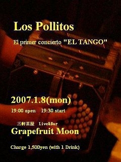Los Pollitos Primer Concierto "El Tango" 2007年1月8日(祝)成人の日 三軒茶屋 GRAPE FRUIT MOON (地図はこちら) http://sound.jp/pollitos/ 19:00開演 料金:1500円(1ドリンク付き) チケット希望の方はメールください