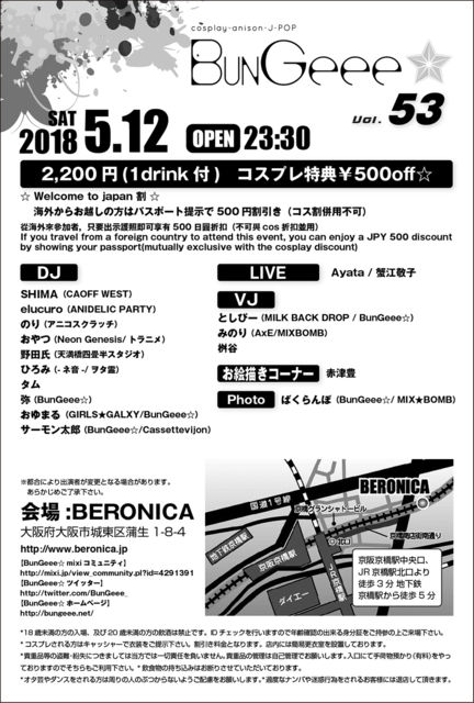 DATE: 2018年5月12日(Sat) TIME: 23:30 OPEN GENRE: アニソン&J-POP etc. PRICE: 2200円(1drink付) コスプレ特典¥500off☆ ☆ Welcome to japan 割 ☆ 海外からお越しの方はパスポート提示で500円割引き(コス割併用不可)