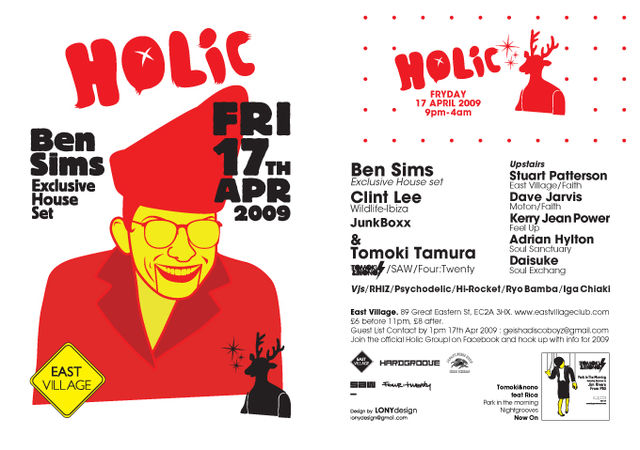 HOLIC is back to East Village on this month with a special guest UK legend Ben Sims. He plays EXCLUSIVE HOUSE SET for holic and a more guest Ibiza zoo project Main man Clin Lee! alongside resident DJ Tomoki Tamura aka Tomoki&nono playing all that is good about house music - from deep, minimal tech and melodic early on to more upbeat electrified sounds later. this is not an event to miss. Check out Ben Sims biog below!!!