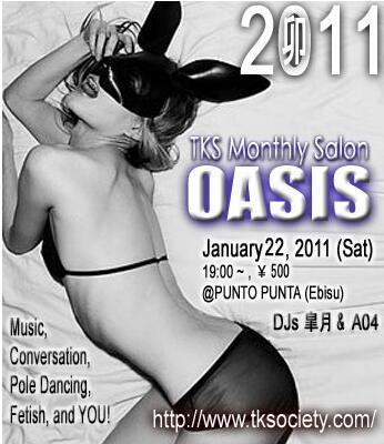 Event: Oasis Salon (Casual DJ Lounge and chat event) Place: Ebisu PUNTO PUNTA When: January 22 (Sat) 7pm - 10pm (but usually goes later...) 【Monthly: Please see schedule at our homepage】 Poledancing by the Oasis Girls! Resident DJs: Satsuki and A04 http://www.tksociety.com