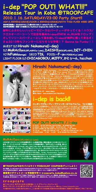 新年にふさわしいハッピーでピースなパーティーがやってくる!ハウス/クロスオーバーシーンで注目を集めたi-depがNEW ALBUMをドロップ!そしてリリースパーティーとして満を持してi-depが神戸に帰って来るぞ!さぁ2010年もファンキーになりそうな予感!? Gonna be Funky!!