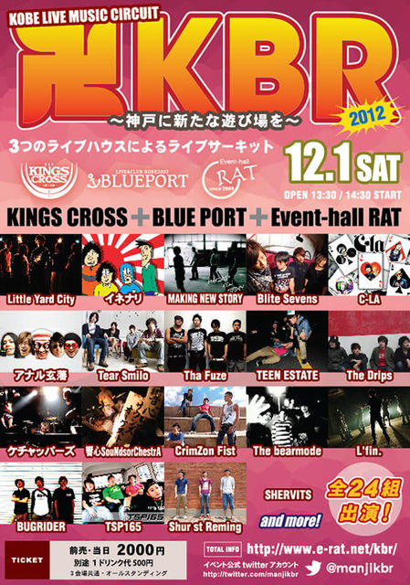 [DATE]2012.12.1 Sat. open 13:30 start 14:30 [PLACE]神戸KINGS CROSS/BLUEPORT/Event-hall RAT(3店舗サーキット) [出演] <BAND> Little Yard City/イネナリ/MAKING NEW STORY/Blite Sevens C-LA/アナル玄藩/Tear Smilo/THA FU'ZE/TEEN ESTATE The Drips/ケチャッパーズ/響心SouNdsorChestrA/CrimZon Fist The bearmode/L'fin/BUGRIDER/TSP165/Shur st Reming SHERVITS/and more...