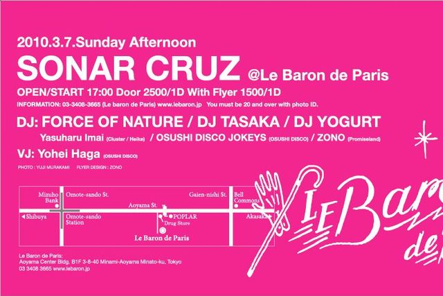 03.07 (SUN) SONAR CRUZ@Le Baron de Paris 日曜の午後今までに類を見ないパーティをルバロンで開催する事になりました。