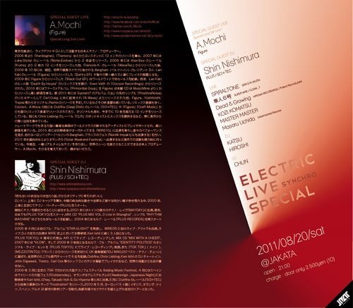 ------------------------------------------------------------------------- SYNCHRO "Electric Live Special" SPECIAL GUEST LIVE : A. Mochi (Figure) Special Long Set Live!! SPECIAL GUEST DJ : Shin Nishimura (PLUS / SCI+TEC) : LIVE : SPIRALTONE(SERi&M.UKUDA) / 隼人6号(SUPER WISE/CLEAR...?) / Dead&Growing (HINOWA RECORDINGS/Polena Records,Italia) / KOZI KOMATSU / MASTER MASTER / Masaru Uchida (GobsmackedRecords) DJ : KATSU / HIROSHI VJ : CHUN