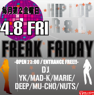 Club Partyの中で不動の人気を誇るジャンルであるHIPHOP R&B。数々のEVENTの中から激選されたDJ達が今流行りの旬な選曲でフロアを盛り上げます!! そして今回は足利を中心に活動する重要人物、DJ YK ,DJ DEEPが参加! "MIX CD W RELEASE PARTY"を控えている2人のプレイは必見! 他のClubよりいち早く新譜Checkが出来る事間違いなし!! 第二金曜日は"Freak Friday"にて音と共に騒ぎましょう!!