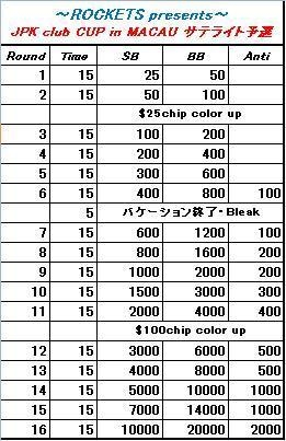 ----------------------------------------------------------------- ■ Buy-in:5,000円 ■ スタートチップ:8,000点 ■ ブラインドストラクチャー:ALL=15分 ■ バケーション:開始から90分(6R終了まで) ■ 1位〜3位=7/9(土)@ LADY SHARK 【JPK club CUP in MACAU サテライトFINAL】への参加権獲得 -----------------------------------------------------------------