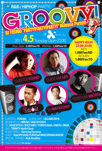 開催終了4/5(火)超豪華ゲスト多数参加!渋谷axxcisにてGROOVY!開催!!!ゲストDJにはYOSHIO,HIROKI,ゲストLIVEにはLEO,MICHIYAが参戦!!!